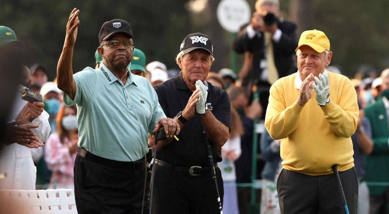 Lee Elder with Gary Player and Jack Nicklaus during the opening ceremony at the 2021 Masters in April. (Kevin C. Cox/Getty Images)